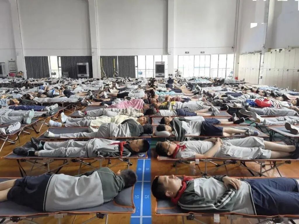 浙江省舟山市第一初级中学学生在体育馆“躺睡”。图源舟山发布