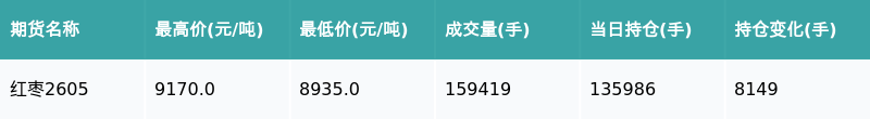 南财智讯3月11日电,盘后期货数据显示,郑州商品交易所的红枣主力合约收涨2.12%,收盘报9140.0元/吨,日内资金流入8486.69万元。其他相关指标见下表: