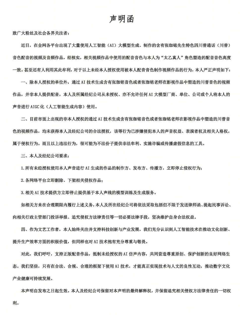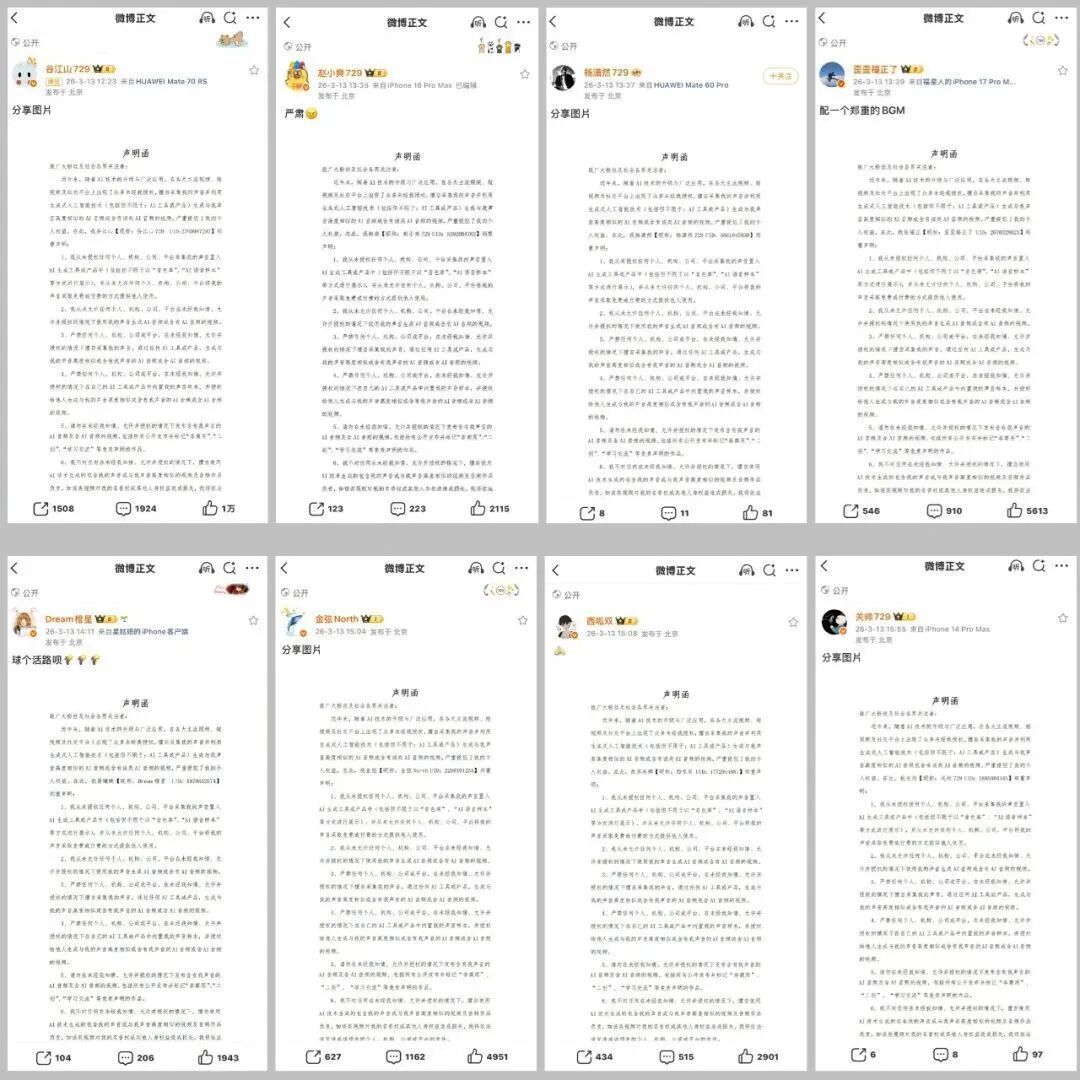 他们在声明函中均提到,对于未经授权生成、发布的包含其声音的AI音频及视频,无论是否标注“非商用”“二创”“学习交流”等免责声明,均属于侵权行为。对于已在网络上传播的侵权AI音视频内容,相关发布者及平台应立即停止传播、下架、删除,并停止继续制作、上传、分发。