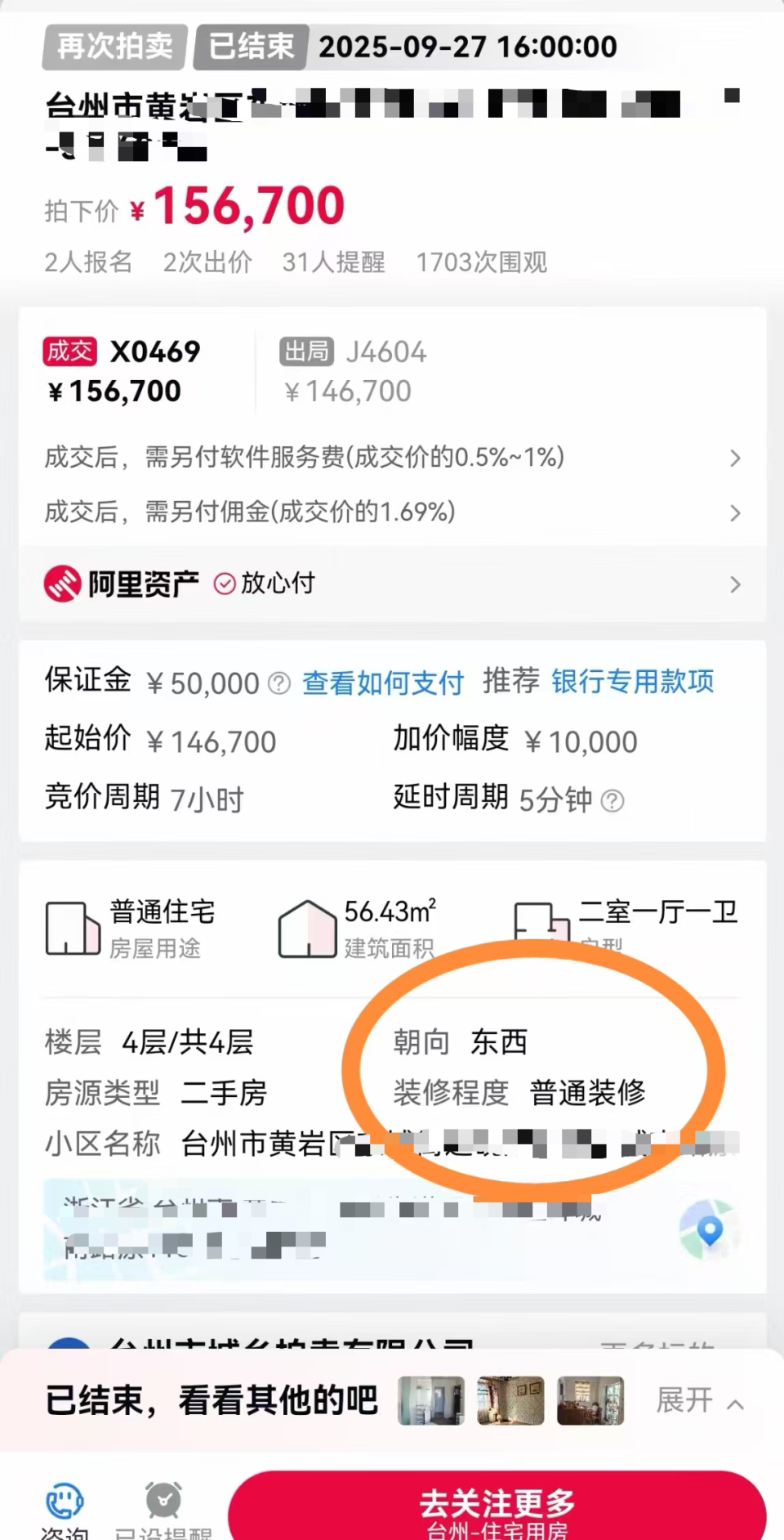 方先生提供的一份网上拍卖截图显示:2025年9月27日,成交价15.67万元,保证金5万元,朝向为东西。方先生说:“第一次写南北朝向卖30万,第二次写真实的东西朝向只卖15万,这中间的差价,是疏忽还是故意?”